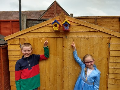 We painted and made our own Bird Boxes. Katie glued them to make them strong. Daddy screwed them to the shed. I hope the cats do not eat the birds.